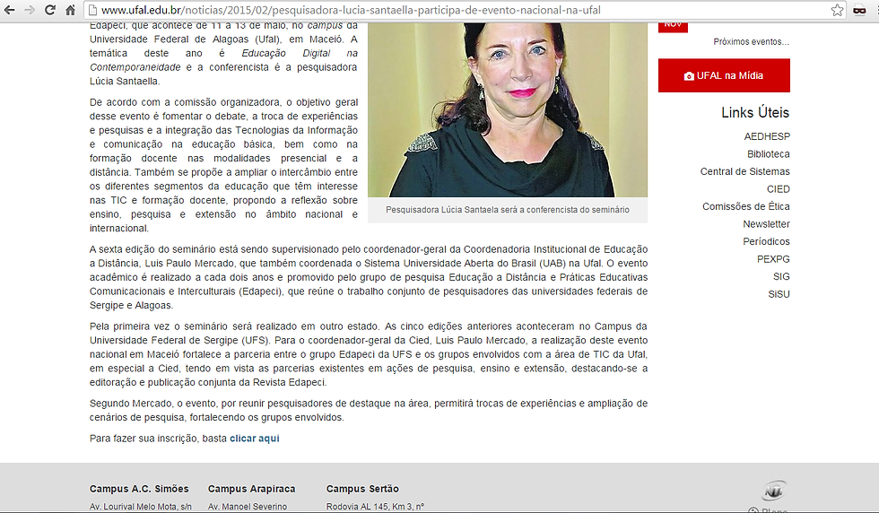Minha apresentação teve foco nos links de expansão que comumente são colocados em matérias jornalísticas. Tive como exemplo a matéria sobre a participação da Lúcia Santaella no Edapeci, ocorrida no dia 13 de maio, no auditório da Reitoria da Ufal.